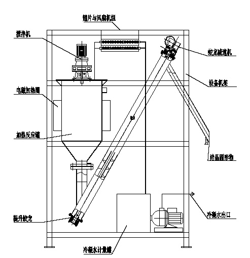 3.3.5蒸發結晶器 設備工作原理 結晶蒸發器主要由進料氣動泵、加熱單元、蒸發反應罐、彈簧刮刀攪拌器、抽風機、冷卻翅片風扇、蛟龍出料裝置、監測控制儀表組成,終實現全自動運行的結晶蒸發器。 設備工藝流程動作如下: 設備工作動作 ①氣動泵進料到蒸發反應罐,并受蒸發反應罐內液位控制; ②電磁加熱圈受蒸發反應罐內溫度控制,進行加熱供熱自動控制模式; ③蒸發罐內蒸發,加熱面采用彈簧刮刀清理結垢,防止物料黏附影響換熱效率。 ④水氣蒸發,二次蒸汽經抽風機引入冷卻翅片風扇,蒸汽冷凝成冷卻水。 ⑤蒸發罐內物料濃縮,開始結晶,結晶物通過提升蛟龍提升到系統外后委外處理。 |